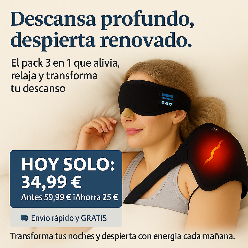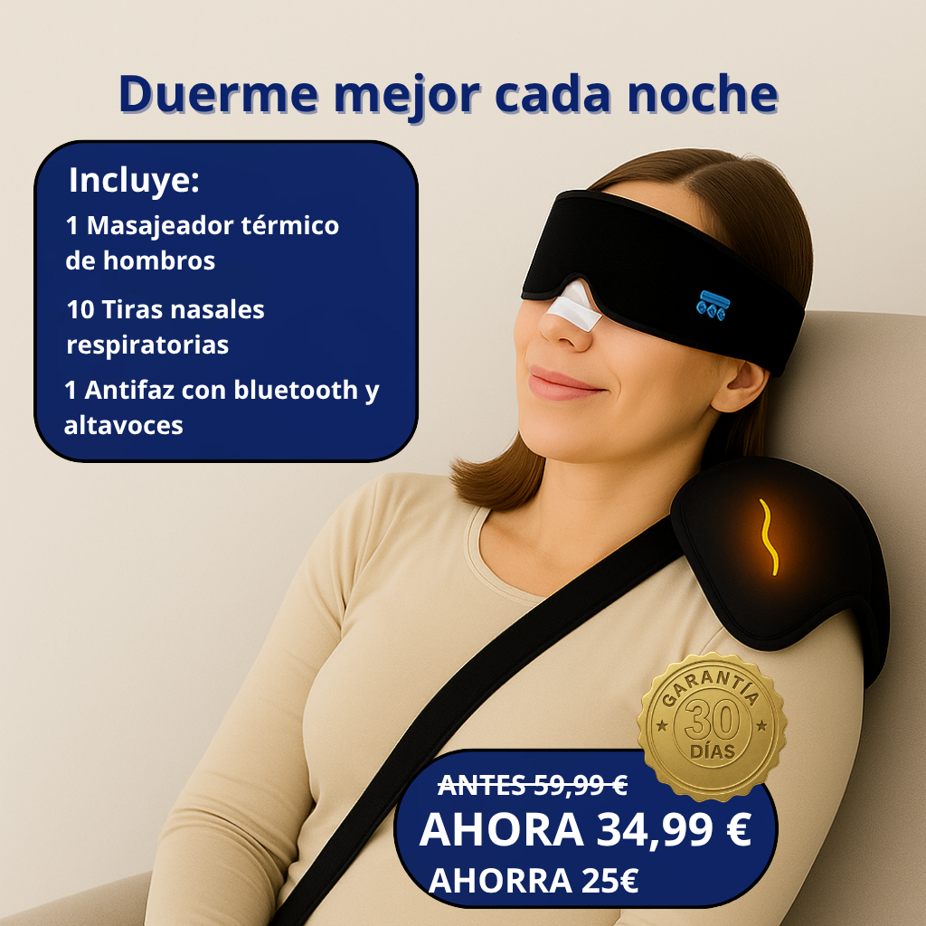 Tres productos, una sola experiencia: Bandas Nasales, Antifaz Bluetooth y Almohadilla Térmica. Diseñados para ayudarte a respirar mejor, dormir más profundo y liberar toda la tensión del día. Convierte tu descanso en un ritual de bienestar total.